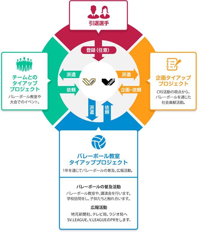 トップレベルで培った技術や経験を広め、バレーボール界を盛り上げていくプロジェクトです。