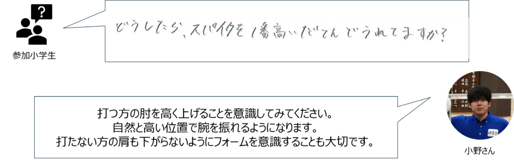小野さんからは、強打レシーブの時の足の使い方やスパイクジャンプの高く跳ぶ方法を教わりました!