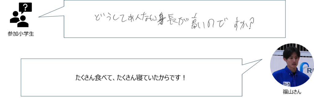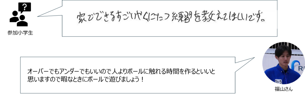 ■保護者B:子供達がとても楽しそうで良かったです。トップレベルで試合経験のあるバレーの先輩に直接指導してもらえてお話をしてもらえたのが、子供達のバレー人生の大きな変化となると思いました。